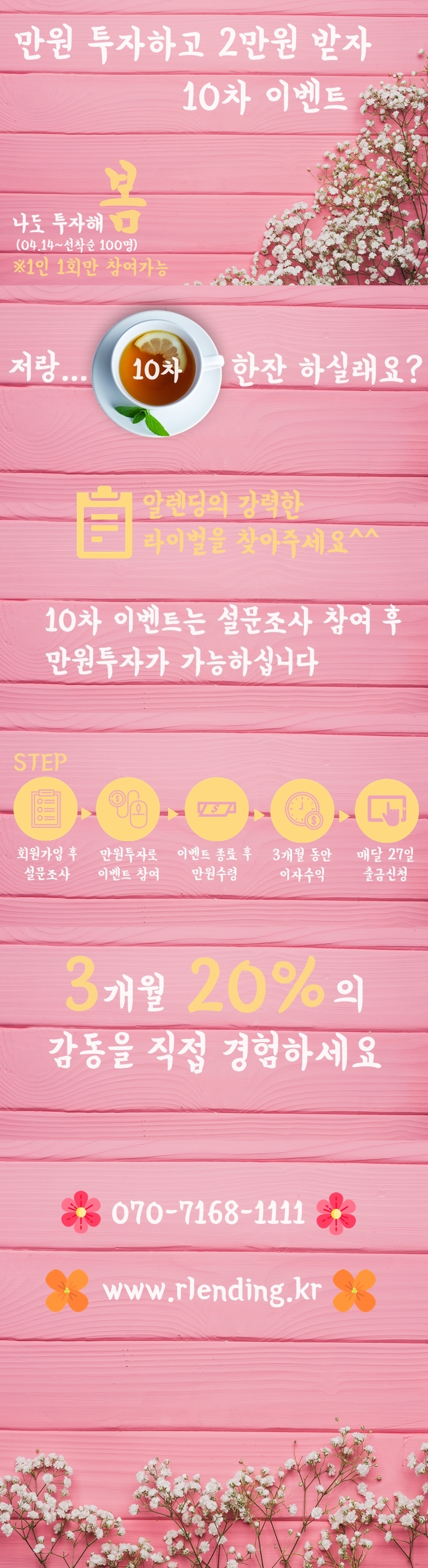 - 입금된 1만원은 투자 목적으로만 사용할 수 있으며, 즉시 출금은 불가합니다. 단, 투자에 사용된 이후에는 제한 없이 자유롭게 출금이 가능합니다. (상환일정은 문자를 통해 안내해 드립니다.)